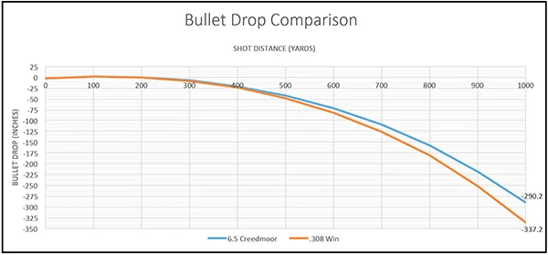 Compared to the .308 Win 178 grain BTHP with a G1 BC of .53 and muzzle velocity of 2600 FPS (from the Hornady box) the 6.5 Creedmoor has 110 inches or 9 feet less drop at 1,000 yards. The 6.5 CM would also experience roughly 13 inches less wind drift at 1,000 yards in a 10 MPH crosswind. So not only does the new 6.5 shoot better than the .308, it also has less kick, making it much more enjoyable to shoot.