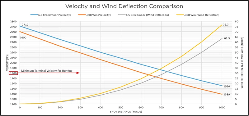 So we know that the 6.5 CM is a viable round for long range target shooters, but the question still remains if it could be used as a hunting round. For big game you probably want a bullet like the A-MAX to have a muzzle velocity of at least 1500 FPS down range and over 900 ft-lbs of energy. The 6.5 Creedmoor stays above this threshold out to about 800 yards so it is definitely a viable option for tipping over a big buck out to 800. For predator hunters this would be a fun gun to kill wolves or coyotes even out to 1,000 yards.