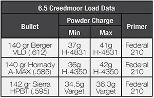 The 6.5 Creedmoor has a case length of 1.92 inches and a max cartridge length of 2.82 inches to allow it to fit into the short actions. It fits on the .308/30-06 bolt face so it’s an easy choice for someone who is wanting to rebarrel their .308, but is looking to try something new. The case has a steeper 30-degree shoulder to allow for maximum powder capacity while still leaving room for the longer profile of the high BC bullets. For the factory ammunition, Hornady now loads the 6.5 Creedmoor with the 120-grain A-MAX and GMX, the 129 grain Interbond and SST and the 140-grain A-MAX. The factory ammunition has the reloading recipe written right on the box making it very user friendly for those that want to duplicate the Hornady ammunition on their own, or try to improve on it.