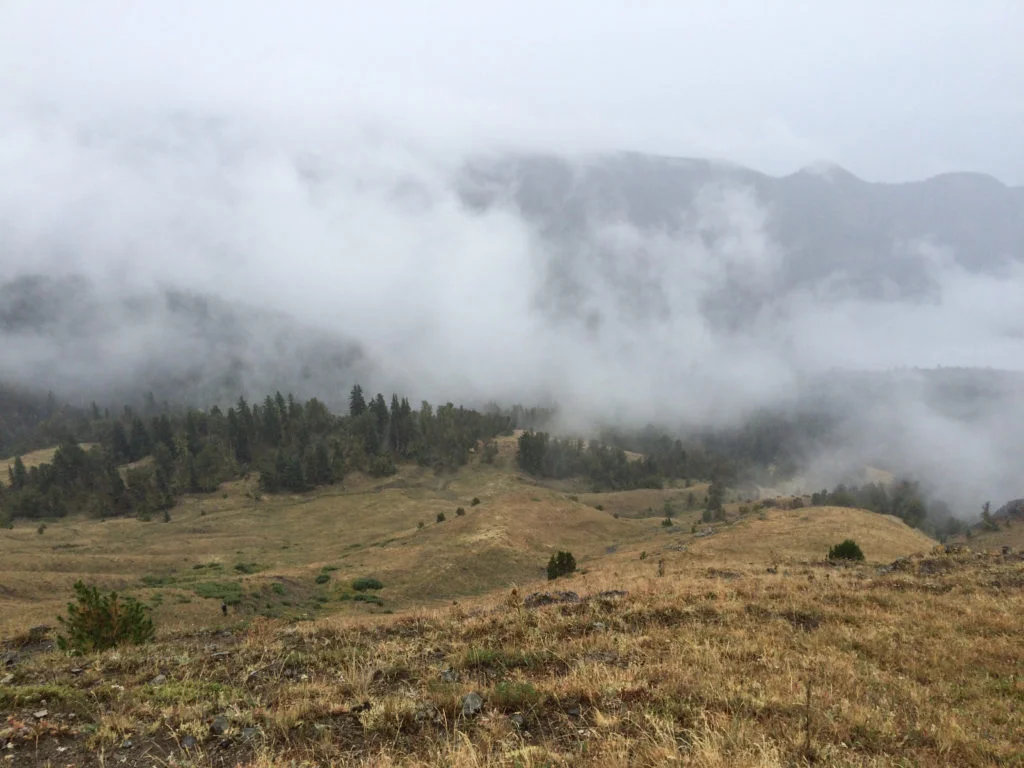 I crested the top of the ridge just before midnight, and quickly set up my tent and crawled into my sleeping bag completely exhausted. Despite the wind picking up as I started to doze off, and the tent feeling like it would blow over with each escalating gust, I must have been too tired to care; I quickly fell fast asleep, dreaming of an encounter with the General the next morning. My alarm went off a half hour before daybreak and I could still hear the wind howling outside the tent. I quickly got dressed and struggled to get the stove lit so I could boil water for a warm cup of oatmeal and a coffee. As I sat there, the hood of my Sitka raincoat sucked tight around my head to block the wind, I thought it crazy that a week ago it was easily 15 degrees warmer.