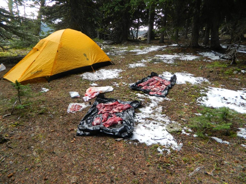 We rolled out of our packs and took a quick rest, then took all the meat out of our packs and spread it out to cool properly before hanging it up for the night. While Terry collected the wood and got the fire going, I carved up some tenderloin medallions and seasoned them. As the fire started to crackle, we lay beside it to warm up, rest our weary joints, and cook up some well-earned meat. The first taste was a true reminder of one of the main reasons we do this – pure organic protein goodness; a better bite I have never had!