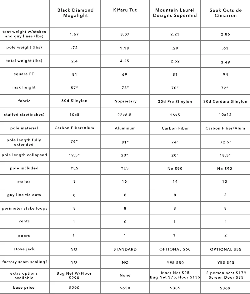 The Black Diamond Megalight was the first pyramid shelter I used for backcountry hunting. It is an update from the old shelter I used a few decades ago with improved peak ventilation and modern silnylon fabric. I've spent countless nights in this shelter in every imaginable type of weather; from hot sweltering, bug-infested, to week-long downpours, to below freezing, blowing snow storms. It is the baseline to which I can compare other shelters of similar shape and size, which is exactly what I did this spring and summer. I tested and compared three additional models of pyramids of similar size and took detailed notes of the features, construction quality, ease of use, and likes/dislikes.